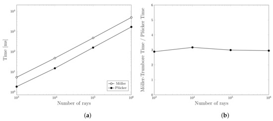 Computation time comparison for intersecting 10,000 triangles with an increasing number of rays using Möller-Trumbore and Plücker-based algorithms. (a) Computation time, (b) Ratio between the computation times of the two algorithms.