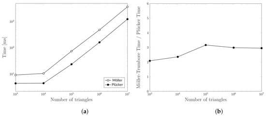Computation time comparison for intersecting an increasing number of triangles with 1000 rays using Möller-Trumbore and Plücker-based algorithms. (a) Computation time, (b) Ratio between the computation times of the two algorithms.