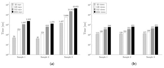 - Jiménez, J.J.; Ogáyar, C.J.; Noguera, J.M.; Paulano, F. Performance analysis for GPU-based ray-triangle algorithms. In Proceedings of the 2014 International Conference on Computer Graphics Theory and Applications (GRAPP), Lisbon, Portugal, 5–8 January 2014; pp. 1–8. [Google Scholar]