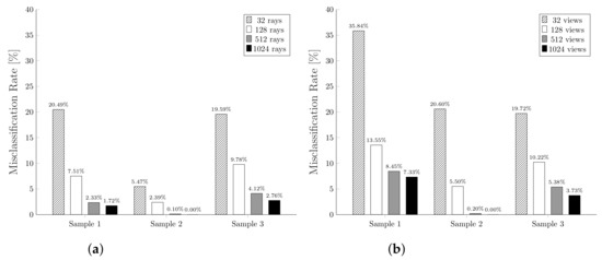 Figure 17 shows the misclassification rates obtained using a different number of rays, or corresponding views, for each of the designed mesh samples. From these plots we can observe how, as the number of rays or views increases, the misclassification rate decreases. This is widely expected since, using fewer views or rays per triangle, it is more likely to misidentify a visible triangle as invisible and, thus, increase the number of false positives. Intuitively, having more views or rays per triangle allows the algorithm to find even the most hidden triangles, getting closer to the optimum value.