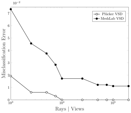 From Figure 18 we can observe that our algorithm tends to the optimal faster than the method in comparison. Actually, as described previously, MeshLab VSD method operates in image space and it is constrained to a maximum resolution of 2048 × 2048 pixels [32]. As a result, even if the number of views increases infinitely, this method could never reach the optimal since sphere mapped points would have a finer quantization than the rendered image. This explains why the improvement in accuracy is so slow after a certain number of views. To be more precise, we report in Table 1 the evolution of the two misclassification rates with an increasing number of rays or views. In particular, we can notice that, using 10,000 rays, our algorithm is able to converge to the optimum while, MeshLab algorithm, stabilizes around of error.
