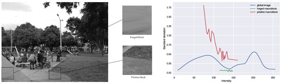 The aforementioned methods estimate a single and constant noise level, namely an additive white Gaussian noise (AWGN) model. However, this hypothesis does not hold in realistic scenarios since noise levels depend on the image intensity [40]. More recent methods consider this fact and estimate a noise level function (NLF) rather than a single noise level. In [41], the authors proposed to jointly estimate the NLF and the camera response function (CRF) by segmenting the image into edge and non-edge regions. Noise level functions are then compared and an empirical threshold is fixed in order to detect salient curves. The methods introduced in [42,43] instead analyze a histogram based on the noise density function at the local level in order to reveal suspicious areas. The method proposed in [44] computes an NLF-based on Wiener filtering. Local noise levels in regions with a certain brightness are assumed to follow a Poisson distribution, according to which, the larger the distance to the NLF, the higher the probability of forgery. On the other hand, the approach developed in [45] consists of estimating a noise level function that depends on the local sharpness rather than on the intensity.