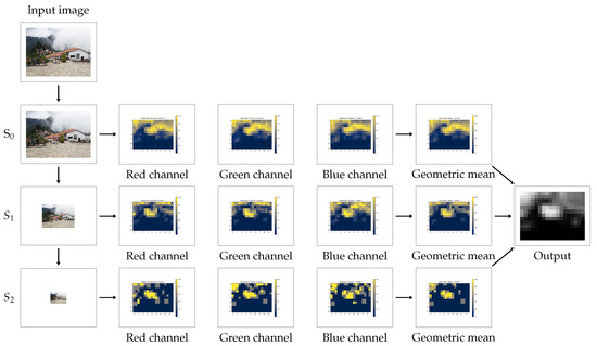 Complete pipeline of the method: successive scales are extracted from the input image. At each scale, one heatmap per color channel is computed and then combined according to their geometric mean. Finally, the obtained heatmaps at each scale are summed and normalized to produce the final output.