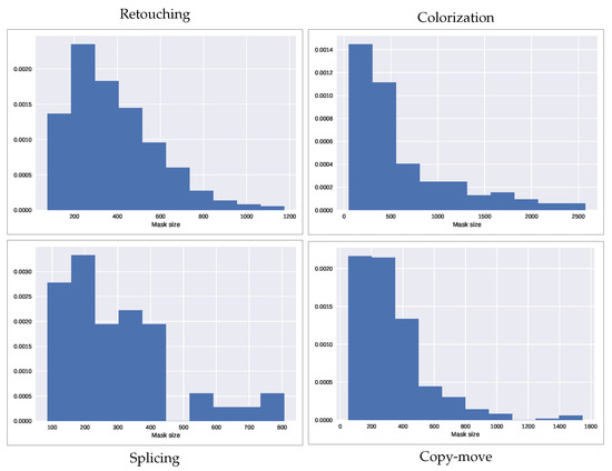 In order to evaluate the capabilities of the method, we carried out an analysis of such performance depending on the size of the macroblocks. We tested three possible values for W: 512, 384 and 256. The results, presented in Table A1, suggest that the best performance is achieved for . Indeed, for the retouching, colorization and copy-move datasets, the best scores are obtained when considering macroblocks of size . On the other hand, when considering the splicing dataset, macroblocks of size yield a better IoU score. However, the difference is very small and when considering other metrics, achieves higher scores.