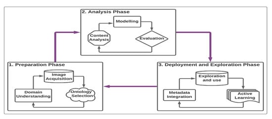 The proposed methodology (Refer to Figure 1) is organised into preparation, analysis, and integration and exploitation phases. The first phase focuses on acquiring, understanding, and representing the target domain and its related data. The second phase deals with the extraction of the content of the images using CV models and the last phase focuses on the integration and exploitation of the results of previous phases to provide rich information. The methodology follows an iterative and continuous improvement in each of the phases.