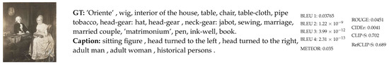 In order to explore how the proposed approach works on another artwork dataset, a subset of 52,562 images of paintings from the WikiArt, www.wikiart.org (accessed on 1 February 2020), collection was used. Images in the WikiArt dataset are annotated with a broad set of labels (e.g., style, genre, artist, technique, date of creation, etc.); therefore, one aspect of the evaluation process includes analysing how the generated captions relate to genre labels because genre labels indicate the category of the subject matter that is depicted (e.g., portrait, landscape, religious paintings, etc.). Furthermore, this dataset is used to explore the difference between captions generated using a model trained on artwork images and models trained on natural image datasets.