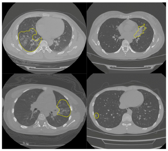 In this study, the online COVID-19 Lung CT Lesion Segmentation Challenge—2020 (COVID-19-20) dataset was used to train and test our model. The dataset contains 199 lung studies with a matrix resolution of 512 × 512 and with labels provided by the Challenge [26] (four CT examples are shown in Figure 1). Dataset annotation was made possible through the joint work of the Children’s National Hospital, NVIDIA and the National Institutes of Health for the COVID-19-20 Lung CT Lesion Segmentation Grand Challenge. The aim was to identify and segment the lung subregions infected with the disease. Since DL networks require inputs of the same size for training, CT voxels were resampled to the isotropic size of 1 × 1 × 1 mm3 using linear interpolation. We implemented the network and the Tversky loss function [27] (see Section 2.3) using Keras with Tensorflow backend in the open-source language Python (www.python.org, accessed on 1 January 2021). We used the whole dataset in a k-fold (k = 5) cross-validation fashion, as explained in Section 2.4.