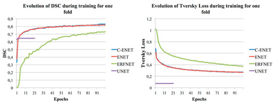 UNET [24] was unable to achieve any convergence after more than twenty-one epochs (with reference to Figure 2 where the training DSC and Tversky loss function [27] plots are shown for one-fold and for each considered algorithm), unlike our previous studies whose purpose was the segmentation of the whole lung, aorta, and prostate [19,20,21]. Specifically, during the training, the network immediately gave a low value of Tversky loss (0.075) and a value of DSC = 62.79%. The network maintained the same values after twenty-one epochs, consequently, the training was stopped (the training loss did not decrease for 10 consecutive epochs). Although the network maintained low Tversky loss values, it was unable to learn; in fact, by testing the validation dataset, we obtained a DSC of 0%. A further test was performed with a modified version of UNET where all 3 × 3 convolutions were replaced by larger 5 × 5 convolution operators as reported in [19], and similar results were obtained. For this reason, UNET was not included in Table 2. Figure 2 also shows how C-ENET and ENET models outperformed the other two models. Specifically, both models achieved a training DSC greater than 80% in less than 50 epochs.
