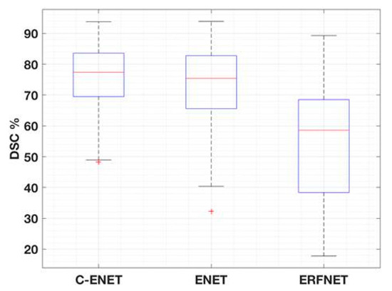 Table 4 shows the multiple comparison using the Tukey HSD correction technique. C-ENET was significantly different from ERFNET but not from ENET. However, DSC-based boxplots were also calculated (with reference to Figure 3) to further evaluate the differences in algorithm performance. Although C-ENET and ENET methods obtained very good performance, C-ENET showed a DSC distribution on average greater and with less variability than ENET. Consequently, it can be assumed that C-ENET focuses on higher performance values. Examples of obtained results are shown in Figure 4.