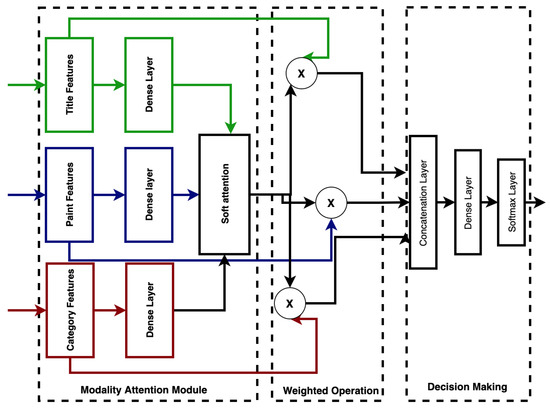 where and are the trainable fusion parameters, s is an n-dimensional vector, and in this experiment (representing the modalities title, paint and category, respectively). We computed soft attention over the original modality features and concatenated them as in [34,40]. A dense layer was used to learn the associations over weighted modality-specific features by: