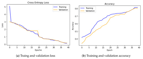 Cross-entropy loss and accuracy during the training and validation steps are shown in (a,b), respectively.