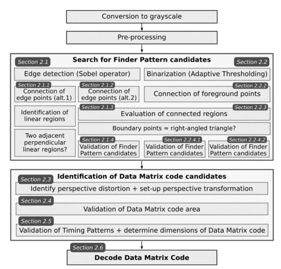 In the following sections, we will give an overview of several methods for localization Data Matrix codes in images which all utilize a typical “L” shaped Finder Pattern. The individual steps of the Data Matrix code localization algorithms are schematically shown in Figure 2 (some steps are common to different algorithms/methods).
