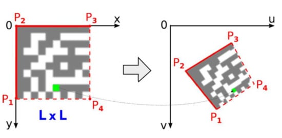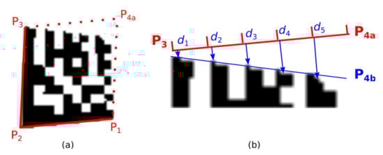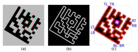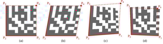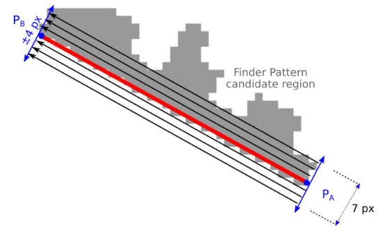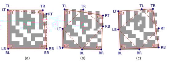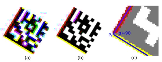 If formula Equation (10) applies then the vertices are arranged counter-clockwise so that PA is top-left, PB is bottom-left and PC is the bottom-right vertex of the Finder Pattern [13]. In this case, the vertices PA and PB are swapped so that the vertices are arranged clockwise.