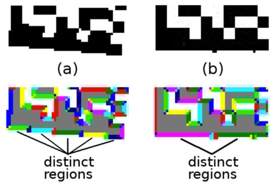 - Adding an intermediate step, where also nearby (their distance is at most 2 points) distinct regions of a similar direction (their difference in angles is at most 7.5 degrees) are marked as equivalent (Figure 5a; this situation can occur with synthetic Data Matrix codes, where there are “sharp stairs”);