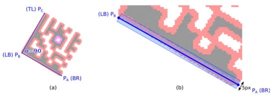 A Finder Pattern candidate region is described by three vertices—boundary points—PA, PB, and PC, which form an isosceles right-angled triangle (Figure 7a; some tolerances must be taken into account with respect to possible geometric deformations of a Data Matrix code). However, the initial position of the line segments PA-PB and PB-PC may not be optimal.