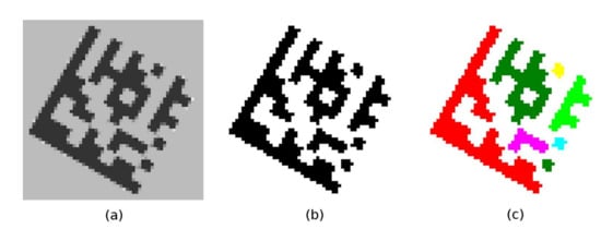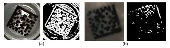 Based on the assumption that the Data Matrix code is a darker object relative to its immediate surroundings, the adaptive thresholding technique is used. The expected result is that the points belonging to the dark modules become foreground points and the points belonging to the light modules become background points (Figure 8b). Adaptive thresholding techniques are able to distinguish dark and light points even when the image is unevenly illuminated. For each point in the image, an individual threshold T(x, y) is calculated, which is based on the intensity values of the points around it. In addition to the local mean m(x, y) (Equation (5)), local variance s2(x, y) (Equations (6) and (7)) is often used [10,11,12].