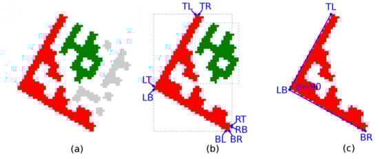 Each candidate region is also described by 8 boundary points (Figure 9b) denoted as TL (Top-Left), TR (Top-Right), RT (Right-Top), RB (Right-Bottom), BR (Bottom-Right), BL (Bottom-Left), LB (Left-Bottom), LT (Left-Top). If the candidate region should be a Finder Pattern, then at least three points must form the vertices of an isosceles right-angled triangle (Figure 9c). The boundary points form two quadrilaterals, defined by four points: