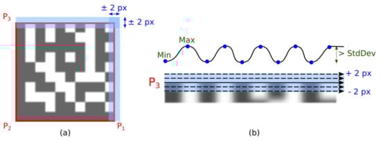 (Note: By maximizing the standard deviation in the edge projections, it is also possible to iteratively determine the position of P4 in case the Data Matrix code is perspective distorted. We introduced this approach for QR Codes in [15]).