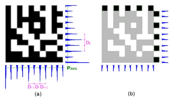 Horizontal and vertical edge projections of the Data Matrix code. (a) projections of the whole area; (b) projections of the Timing Pattern.