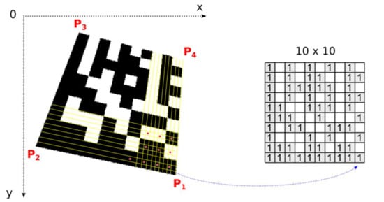 Once the precise location of all four corner points, which form the bounding quadrilateral, is established, perspective transformation is set up and the number of rows and columns is determined, we can map image points from the Data Matrix code in the image to the square binary matrix (Figure 18). Dark modules must be mapped to binary 1 and light modules to binary 0. This binary matrix is the input of a deterministic process that decodes the data stored in the Data Matrix Code.