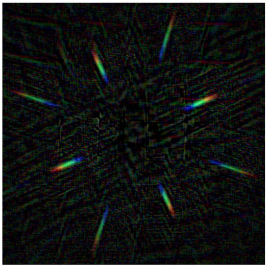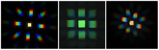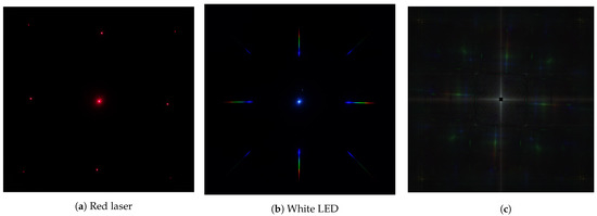 In our work, the phrase diffraction imaging refers to taking photographs with a photographic camera that has a transmissive diffraction grating placed on its optical path. Previously, diffraction images have been used for spectral and hyperspectral imaging [17,20,28,29], as part of the so-called computed tomography spectral imaging (CTSI) approach, as well as for estimating camera spectral responses [21]. In these uses, the purpose of the diffraction grating is to disperse light into multiple dislocations at the camera’s sensor plane in relation to the wavelength of light. Assuming perpendicularly incident rays to a regular transmissive diffraction grating (We use “regular diffraction grating” to refer to a regular pattern of a rectangular or parallelogram grid. This is in contrast to an arbitrary diffraction grating pattern, for which diffraction can be described by Fourier diffraction.), the relation between the wavelength and direction of diffraction in one dimension is described by , where D is the spacing between the grating grooves, is the angular direction of the diffracted light, n is an integer denoting the diffraction order, and is the wavelength of light. For small , we can assume the small angle approximation form of , giving us a linear relation between the direction of diffracted light and the wavelength of light. Two-dimensional diffraction gratings function in a similar way, producing diffraction components in directions defined by the axes of the diffraction grating grooves. While the extent of diffraction, i.e., the extent of spatial dislocation, is approximately defined by , the exact geometry of the diffraction grating determines the shape of the diffraction kernel . Figure 1 shows two diffraction images of point-like illuminants: one for monochromatic red light and one for broadband white light. The diffraction image in Figure 1a reveals the shape of the diffraction kernel for a single wavelength , while Figure 1b reveals the shape of the diffraction kernel by superimposing all the wavelengths onto a single image.
