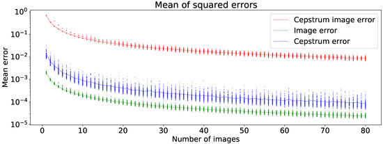 Cepstrum profile and cepstrum image mean-squared errors as a function of the number of cepstrum images from which the mean cepstrum image is computed. The error is the difference between the mean cepstrum image compared to the the mean cepstrum image computed from 140 cepstrum images, i.e., the proxy ground truth. The cepstrum profile error (labeled cepstrum error) is significantly smaller than the cepstrum image error.