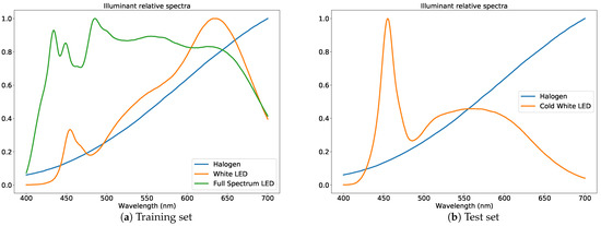 Relative spectra of the illuminants used in capturing diffraction images for the training and test set, respectively.