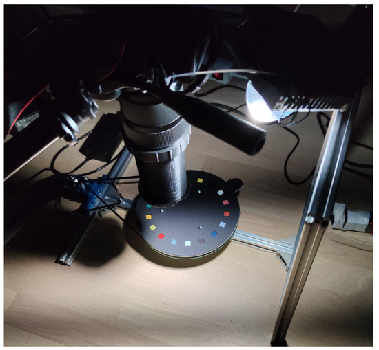 The imaging setup for diffraction photos consisted of the camera setup as described in Section 4.1 for each camera, a tripod mount, illuminants, color sample discs, a rotating platform, and a remote trigger mechanism. Figure 6 shows the imaging setup with the Canon M3 camera, the full-spectrum LED illuminant, and one of the color sample discs. The cameras were mounted on a tripod such that each image was captured from the same location for each camera. The cameras were placed directly over the color samples at appropriate heights so that color samples were entirely visible in the captured images. Illuminants were placed to one side in relation to the color discs and at an angle to avoid possible specular reflections from the color samples. The color sample discs were placed on a rotating platform that was accurately rotated using a stepper motor via a timing belt. The Canon M3 was remote controlled using the gphoto2 [44] software. The Raspberry Pi HQ camera was attached to a Raspberry Pi 4 computer using the CSI interface and controlled using custom software. The Samsung S10 was remote controlled via Bluetooth using custom software on an ESP32 SOC device. In all cases, the purpose of the remote control was to trigger the photo capture without physical contact with the cameras and for the automation of image capture. The rotating platform also enabled the automation of image capturing with manual labor required only for changing the color sample discs, illuminants, and cameras.