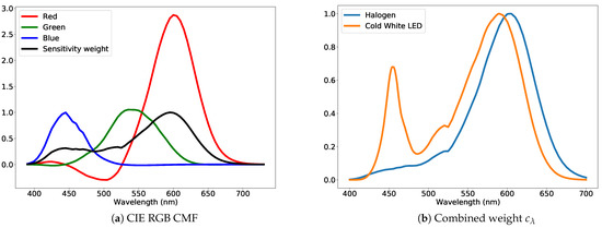 The weighting factor takes into consideration the camera spectral sensitivity, the sensitivity weight, and the spectrum distribution of the illuminant, the illuminant weight, used to illuminate the color patches. Instead of measuring each camera’s spectral sensitivity, we used the mean of absolute CIE RGB color matching function [45] values, as show in Figure 7a. Absolute values were used, because the CIE color matching function for red also has negative values. The reason to use the CIE RGB color matching function values as a proxy for camera sensor sensitivity is that camera sensor spectral responses are designed to be close to these color matching functions. Indeed, a visual comparison of measured camera sensor spectral sensitivity in [48,49] to CIE RGB color matching functions reveals a close match. Any previous measurement for the camera sensor spectral sensitivity would not apply, due to the diffraction grating placed in the optical path. The final weighting factor is the product of the illuminant weight and the sensitivity weight normalized to a maximum of one. For the test set illuminants, the weighting factors are shown in Figure 7b, which are the product of the sensitivity weight in Figure 7a and illuminant relative spectra shown in Figure 5b. To eliminate the effect of the total power of the weighting factor, i.e., the area under the weighting factor curve, the final weighted Canberra distance is divided by the sum of , so the measurement for accuracy that we used becomes: