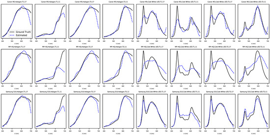 A random selection of relative spectra estimated using the best presented method, the non-negative deconvolution model (blue dashed line) compared against the relative ground truth spectra (black solid line). Each row shows spectra for a single camera with the first half of columns imaged under halogen illumination and the second half under cold white LED illumination.