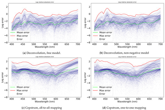 For the cepstrum models, the errors were more concentrated than for the deconvolution models, but at a higher level. For the deconvolution models, the mean absolute error was relatively stable across the entire spectrum, with slightly better performance in the 400–450 nm range. The error of the cepstrum models, although on average higher, was relatively more stable over the spectrum than the error of deconvolution models. Within the range of 550–600 nm, in which most cameras had high spectral sensitivity, the cepstrum models performed slightly better. On average, the 0.95 quantile error was approximately 6.25-times higher for the deconvolution models and approximately 4.8-times higher for the cepstrum models than the mean error, indicating a relatively large worst-case deviation from mean performance for all models and methods.