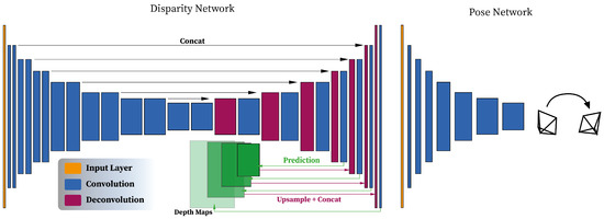 Illustration of the architecture of the Disparity estimation Network (DispNet) with the encoder–decoder layout and a pose estimation network. Additional details in terms of the size of each layer can be found in the original manuscript.