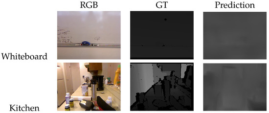 Note that, unlike the prediction, the ground truth exhibited some pixels equal to zero or due to reflective surfaces or distances out of the sensor range. Such non-valid pixels were discarded in the computation above.