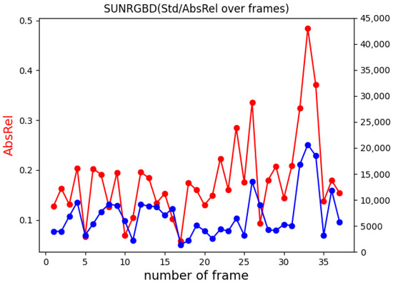 The plot shows in red the absolute relative error (AbsRel) and in blue the standard deviation of depth (Std) for the B3DO sequence from SUN RGB-D Dataset.