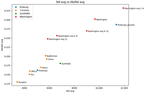 In addition to the absolute relative error, we then analysed the standard deviation () of ground truth depth images, which gives an insight into how challenging an environment is from the learning perspective. The standard deviation of depth shows great potential for understanding the overall structure of the environment; thus, it can be employed in further improvements of the network’s depth prediction. As for the AbsRel, the tests were performed by computing along with the error for each frame pair for every five frames. Figure 8 shows an example of borderline situations taken from SUN RGB-D [35], where in the case of the whiteboard, the measured AbsRel is particularly low, equal to and , on the other hand, in the kitchen image the depth range is larger with 20,639.78, and the resulting absolute error is equal to . By comparing the two examples, we can see that frames with a smaller consist of relatively simple tasks that the network can easily manage; at the same time they often were false positives. This situation was frequent because of the required normalization procedure, which was applied to the predicted depth in order to compare it with the GT. Indeed, for homogeneous surfaces that appear to be orthogonal to the optical axis, the predicted depth map resulted in an almost flat, grey, level image, leading, after the normalization, to an apparently optimal prediction, no matter whether the scale was consistent or not along the entire sequence. On the other hand, the higher the variation in the depth range, the harder is for the network to predict consistent disparity maps. This behaviour is shown in the plot reported in Figure 9, for which the tests were conducted on the B3DO sequence from SUN RGB-D. Unlike the other sequences, B3DO is composed by random frames from different environment; thus, it was a good challenge for the generalization capabilities of the network. As next step we performed the same test on the remaining data (Table 2) to find the contexts in which the network works well and in which ones it is harder for the network to predict the disparity. Figure 10 presents the absolute relative error for each considered sequence in relation to the standard deviation of depth both computed as the mean over the entire sequence. It is arguable from the plot that the absolute relative error is directly proportional to the amount of depth information (given by the standard deviation) that the network has to estimate. More precisely, it is noticeable that for datasets such as 7Scene, SUN RGB-D, and the sequence freiburg_360, where the space is limited and so the overall standard deviation of depth is limited, the network tended to remain consistent and more accurate in its predictions, resulting in lower absolute error. On the other hand, the prediction accuracy decreased when it came to processing wider and more complex environments: the ones belonging to the Washington dataset and the sequence freiburg_pioneer, and this was due to the higher variations in the environmental depth, as can be seen in Figure 10.