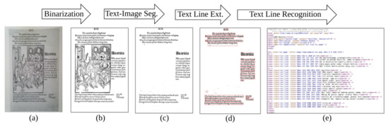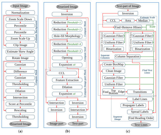 As shown in Figure 2a, the binarization step involves normalization, noise detection and removal, thinning, skew detection and correction, thresholding, and other processes. In the text-image segmentation step, Figure 2b, page segmentation is performed to identify patterns of non-text regions from the document and segment these areas using feature extraction. The third pipeline step of the anyOCR algorithm is based on Gaussian smoothing, which provides high accuracy for text line detection. The complete processing chain of the text line extraction algorithm is depicted in Figure 2c.