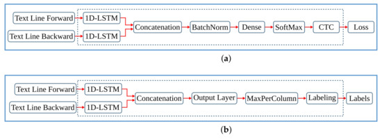 The last step of the anyOCR chain, text line recognition, is based on Bi-LSTM neural network with connectionist temporal classification (CTC) that allows transcribing the text lines without partitioning them down to separate characters. As shown in Figure 3, the topologies used for training and inference have differences. Figure 3a depicts a topology used for training, while Figure 3b presents a modified topology used during inference.