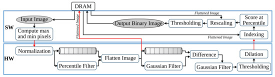 The first pipeline step of anyOCR converts the input grayscale image into binary using PBB. The hybrid hardware-software FPGA-based accelerator of this anyOCR pipeline step is presented in [26]. To design an efficient heterogeneous architecture of this accelerator, the PBB algorithm is partitioned into hardware and software parts, as shown in Figure 4. The binarization architecture is then implemented in a Zynq-7045 device, where the PL contains the hardware part of the algorithm and PS runs the software. In this implementation, the PL and PS of Zynq can run concurrently while communicating through the advanced extensible interface (AXI) ports. Custom direct memory access (DMA) controllers are implemented to transfer data between PS and PL. The implemented accelerator, running at 166 MHz, outperforms the runtime of the original anyOCR software by 20×. Furthermore, it achieves an energy efficiency at least higher compared to the low-power embedded processors (ARM Cortex-A9, ARM Cortex-A53).