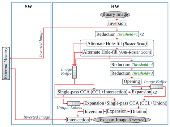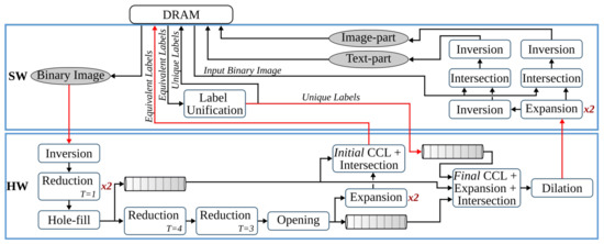 This pipeline step separates the text and non-text parts of a document image, using a multiresolution morphology-based text and image segmentation method. In [30], we have presented the first heterogeneous hardware-software architecture based on an optimized version of the text and image segmentation algorithm of anyOCR. Furthermore, this algorithm is partitioned into hardware and software parts, as shown in Figure 5, where time-critical operations with high parallelization capability are offloaded to the FPGA fabric. Based on this architecture, a heterogeneous hardware-software system is implemented on the Zynq-7045 device. Compared to the original anyOCR implementation, this accelerator has achieved a 3.7× speedup in performance and a 139.8× improvement in energy efficiency. Moreover, the hybrid accelerator has outperformed the optimized software implementation of the text and image segmentation algorithm by 2.7× and 127× in terms of performance and energy efficiency, respectively. However, the software part of this hybrid accelerator is very inefficient due to the sequential and time-consuming union-find algorithm. Hence, in [27], we have presented a new optimized heterogeneous architecture based on an improved text and image segmentation algorithm. The resulting accelerator has reduced the runtime and improved the energy efficiency of the previous accelerator stated in [30] by 40% and 46%, respectively.