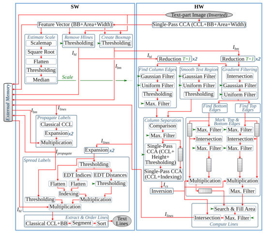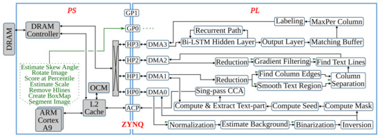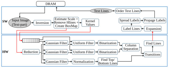 The final preprocessing step extracts the text lines using a Gaussian smoothing-based algorithm. This method has four major processing blocks to estimate text scale, separate columns, find text lines, and extract the lines from the image. The several filters involved in these processing blocks contribute to 85% of the runtime of the text line extraction step. Hence, in [28], the original software algorithm of this anyOCR step is highly optimized and partitioned into hardware and software parts in order to design an efficient heterogeneous architecture, as shown in Figure 6. Based on this architecture, a hybrid accelerator is implemented on a Zynq-7045 device. The resulting hybrid FPGA-based system for the text line extraction step outperforms the original anyOCR software implementation by 135× and 1116× in terms of runtime performance and energy efficiency, respectively.