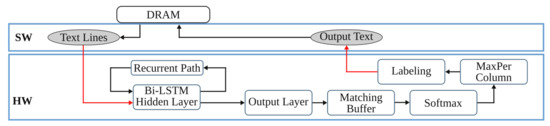 The anyOCR system uses a Bi-LSTM neural network with CTC for text line recognition that allows transcribing the text lines without partitioning them down to separate characters. In [29], we presented the first hardware architecture of the Bi-LSTM network used for OCR. The hardware design is depicted in Figure 7. Most of the steps are based on computing dot products and operations on multiple independent channels that can be efficiently parallelized in hardware. As a result, the complete step is implemented in hardware. The implementation is optimized for online processing, i.e., no batch processing, meaning that the text lines are processed one after another as soon as they are available from the last preprocessing step. Compared to the original anyOCR software running on i7-4790T, the accelerator provides 71× speedup and 935× higher energy efficiency. Meanwhile, it achieves at least 67× higher energy efficiency than embedded processors.