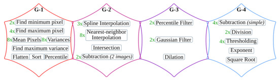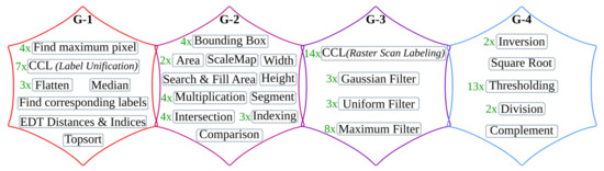 The overall operations involved in the binarization processing pipeline are given in Figure 9 and broadly categorized into four groups. The operations grouped in G-1 are sequential computations that do not benefit from hardware parallelism. The G-2 operations can be offloaded to hardware; however, they are highly resource-intensive. Operations categorized in the G-3 group are window-based computations that have high parallelization capability. The simple arithmetic in G-4 are hardware-friendly and hence, they are the most suitable to implement on the FPGA fabric.