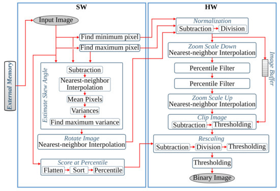 Normalization, skew angle estimation, and image rotation operations involve calculations of minimum () and maximum () pixels. These calculations, including mean pixel, variance, and maximum variance computations required by the image rotation block and the sort operation of the score at percentile operation, are sequential as they require traversing all pixels of an image. In order to accelerate these operations, it would require comparing multiple values in parallel. However, as large sorting networks are resource-demanding, it becomes more efficient to perform sorting in software.