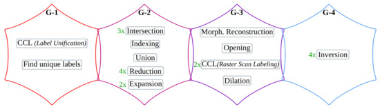 - Bailey, D.G.; Johnston, C.T. Single pass connected components analysis. In Proceedings of the Image and Vision Computing, Hamilton, New Zealand, 5–7 December 2007; pp. 282–287. [Google Scholar]