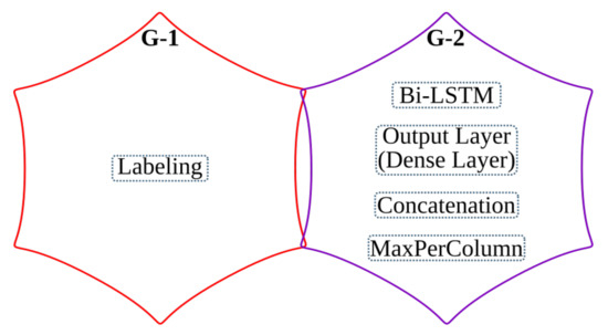 At inference, the batch normalization layer is merged with the dense layer into an Output Layer. We replace the Softmax activation and the CTC with MaxPerColumn and Labeling functions. The MaxPerColumn finds a label with the highest value per column and forwards its index (label) and corresponding value to the next function. The Labeling function processes the labels from left to right. A label corresponding to a class zero is a blank space that separates characters and should not be confused with a space between the words. The Labeling function continues processing until the next blank and finds a label with the maximum value in the block between the blanks. A label with the maximum value is associated with a character that is considered to be represented between the blanks. After decoding the complete input text line, the function outputs a string of labels.