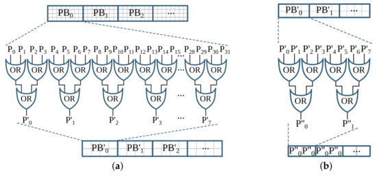 The inverted image is then processed by two reduction operations with thresholds . These operations subsample the incoming image while preserving the density of low- and high-frequency components within the image. After reading a block of four pixels, a reduction operation replaces these pixels by a single pixel depending on the chosen threshold T, according to the formula given in Equation (4). The value of T can be between 1 and 4.