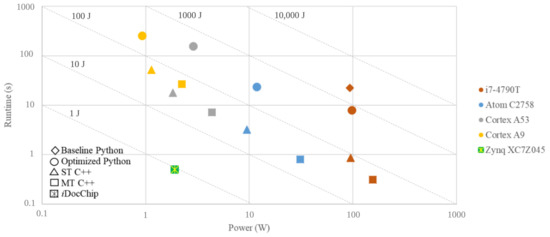- Qasaimeh, M.; Denolf, K.; Lo, J.; Vissers, K.; Zambreno, J.; Jones, P.H. Comparing Energy Efficiency of CPU, GPU and FPGA Implementations for Vision Kernels. In Proceedings of the 2019 IEEE International Conference on Embedded Software and Systems (ICESS), Las Vegas, NV, USA, 2–3 June 2019; IEEE: Piscataway, NJ, USA, 2019; pp. 1–8. [Google Scholar]