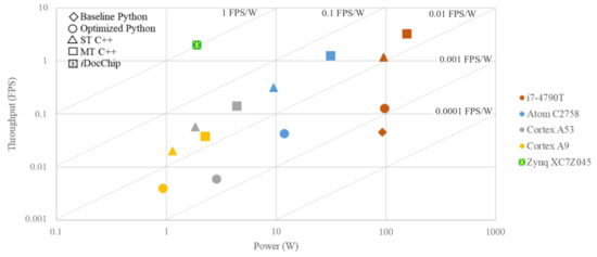 Targeting image processing algorithms, many publications have presented comprehensive comparisons of different processing platforms [31,32,33,34,35]. Brugger et al. [31] have presented a cross-platform analysis of morphological operations implemented on low power platforms: a Low-Power Intel® Core™ i7-4790T CPU, an NVIDIA® Tegra® K1 GPU SoC, and a Xilinx® Zynq® 7020 FPGA SoC. The authors observed that the filtering algorithms implemented on the GPU are 5× slower than a similar implementation on the CPU, while the FPGA implementation is 8–10× more energy efficient compared to the CPU and GPU implementations. In another publication [32], Qasaimeh et al. benchmarked performance and energy efficiency for different vision algorithms implemented on three hardware accelerators that are commonly used for embedded vision applications: ARM® Cortex™-A57 CPU, NVIDIA® Jetson™ TX2 GPU, and Xilinx® Zynq® UltraScale+® MPSoC ZCU102 FPGA. Their results show that while simple and easy-to-parallelize kernels perform well on GPUs with 1.1–3.2× energy/frame reduction compared to CPU and FPGA, for complete vision pipelines the FPGA outperforms the others with energy/frame reduction of 1.2–22.3×. Moreover, the authors also observed that the FPGA performs increasingly better as the complexity of the vision pipeline grows. In [33], Page and Mohsenin have presented a pulse wave spectral Doppler ultrasound imaging system implemented on a Xilinx® Virtex®-5 FPGA and in a 65 nm CMOS ASIC. The authors concluded that the FPGA design has comparable energy efficiency and performance compared to the ASIC implementation while providing reconfigurability and lower costs.