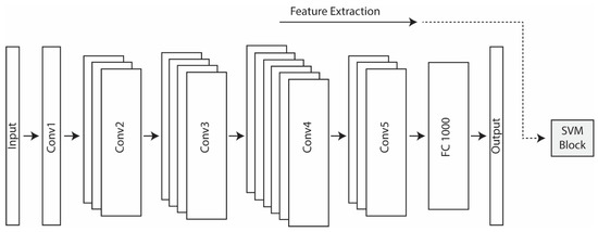 In this work, we extracted features from CNNs [26] that were pretrained on the ImageNet dataset [27]. These features were taken from multiple layers of a CNN and then individually trained on separate SVMs (see Figure 1 and Figure 2). The CNN architectures investigated in this study were GoogleNet (Inception IV) [28], ResNet50 [29], and Densenet201 [30]. GoogleNet, winner of the ImageNet Large-Scale Visual Recognition Challenge (ILSVRC) in 2014, is a CNN with 22 layers. To create deeper layers, GoogleNet uses convolution and global average pooling. ResNet50, the winner of the ILSVRC2015 contest, is a CNN with 50 layers. To overcome the vanishing gradient problem in deep networks, ResNet incorporates a residual connection. DenseNet201 is extremely deep with 201 layers. This architecture replaces the residual connection with densely connected convolutional layers that are concatenated rather than added to each other as with ResNet. All layers are interconnected in DenseNet, a technique that produces strong gradient flow and that shares low-level information across the entire network.