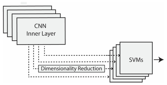 The literature is replete with studies that have investigated training SVMs with features extracted from CNNs (see, for example, [7,10,19,21,22,23,24,25]). SVMs are a preferred classifier mainly because of the computational resources needed to fine-tune CNNs. Replacing the SoftMax or the FC layer of a CNN with SVM greatly reduces training time and has been proven to produce excellent results. Most studies investigating SVMs in this way have pulled features from the last layers of CNNs, with fewer, such as [7], examining lower-level features. studies focused on training SVMs with features extracted from the inner layers have been neglected. Extracting features from the inner layers of CNNs poses a difficulty because such features are characterized by high dimensionality, making them unsuitable for training statistical classifiers like SVM.